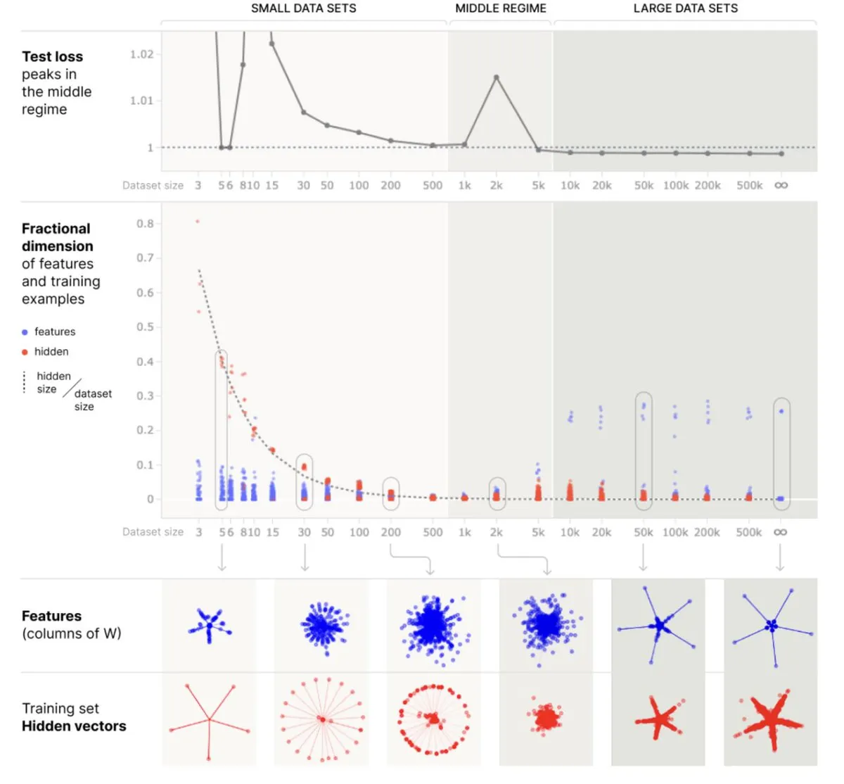 Stochastic Parrots: Do AIs only memorize information without truly compressing it? There are two archetypal ways to represent information in an LLM: either memorize point by point, like a look-up table, or compress the information by only memorizing higher-level features, which we can then call "the world model". This is explained in the very important paper "Superposition, Memorization, and Double Descent" (Anthropic, 2023): it turns out that to store points, initially the model learns the position of all the points (pure memorization), then, if we increase the number of points, the model starts to compress this knowledge, and the model is now capable of generalization (and implements a simple model of the data).