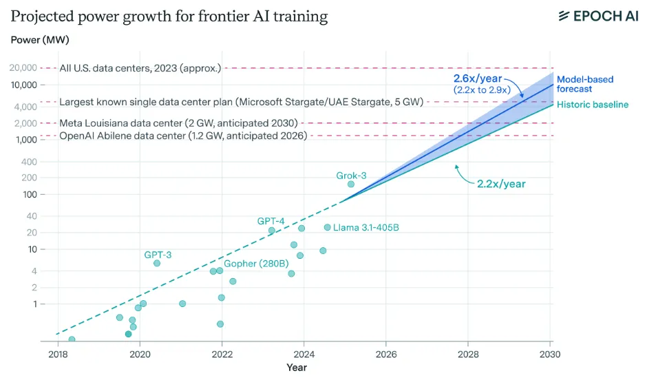 Training frontier models requires enough electrical power to run a small city. GPT-4's training run likely consumed around 50 megawatts, equivalent to powering roughly 40,000 US homes. If compute scaling continues at 4-5× per year, frontier training runs will require 4-16 gigawatts by 2030—matching the Grand Coulee Dam, America's largest power plant (You et al., 2025).
