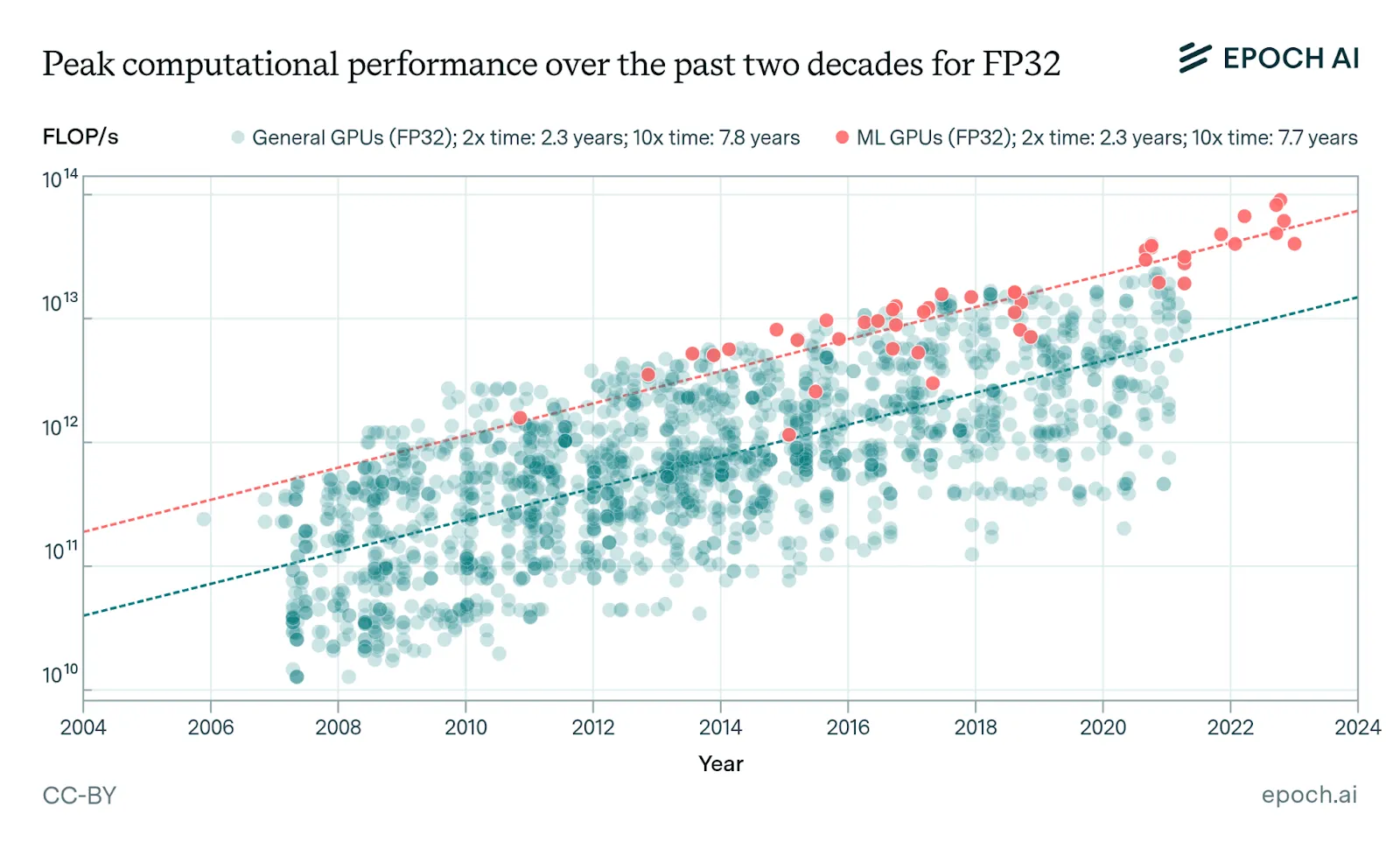 AI chips are getting about 35% more powerful each year, but we're approaching physical limits. Since around 2010, the raw computational performance (FLOP/s) of GPUs in FP32 precision has grown by roughly 1.35× per year (Epoch AI, 2023; Hobbahn et al., 2023). The improvement comes from things like denser transistors, specialized AI circuitry, and switching to lower-precision number formats. Performance per dollar has improved rapidly, and hardware at any given precision and fixed performance level becomes 30% cheaper each year. At the same time, manufacturers continue to introduce more powerful and expensive hardware (Epoch AI, 2025)