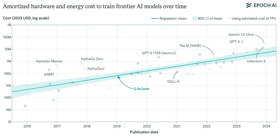 The acquisition cost in USD of the hardware used to train frontier AI models has grown by 2.5x per year since 2016. To give you a sense of how much training a frontier model costs, the total amortized cost of developing Grok-4 (released in July 2025), including hardware and electricity, is estimated at $480 million USD. The acquisition cost of the hardware to train Grok-3, including GPUs, other server components, and networking, is estimated at $3 billion USD. The hardware used to train Grok 4 may have been even more expensive (Epoch AI, 2025).