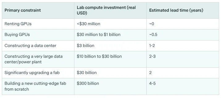 Scaling AI systems to the forecasted levels of 2030 will require substantial power infrastructure. A training run of FLOP would require approximately 6 GW of power, assuming improvements in hardware efficiency. This scale necessitates data center campuses ranging from 1 to 5 GW by the end of the decade (Sevilla et al., 2024). Lead times increase with scale: every additional 10× increase in compute stock adds roughly one year to project timelines. Constructing the necessary large-scale power plants typically takes 2-3 years (Edelman & Ho, 2025). Despite these hurdles, the cost of power remains a small fraction of data center expenses—roughly one-tenth the cost of the chips - making the capital investment rational given the potential returns (Ho et al., 2025).