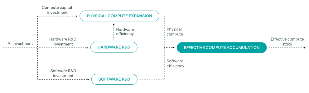 Effective compute combines three independent factors that each multiply your AI capabilities. Scaling laws track performance against compute, but "compute" means more than just counting GPUs. When researchers say GPT-4 used more compute than GPT-3, they're not just talking about running more hardware for longer. They're talking about the growth in ‘effective’ compute measured in ‘effective’ floating-point operations (eFLOPs). As an analogy, think of it like measuring how far a fleet of cars can travel. You need three things: how many cars you have (chip production), how fast each car goes (hardware efficiency), and how efficiently you're driving (software efficiency) (Erdil et al., 2025). The relationship looks like this: