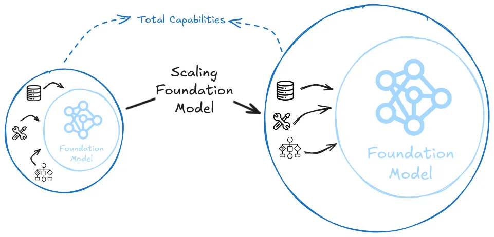 Debates around the scaling laws only tell us about the capabilities of a single foundation model trained in a standard way. For example, by the strong scaling hypothesis we can reach TAI by simply scaling up the same foundation model until it completely automates ML RnD. But even if scaling stops, halting capabilities progress on the core foundation model (in either a weak or a strong way), the external techniques that leverage the existing model can still continue advancing. Many researchers think that this is a core element where future capabilities will come from. It is also referred to as "unhobbling" (Aschenbrenner, 2024), "schlep" (Cotra, 2023) and various other terms, but all of them point to the same underlying principle - raw scaling of single model performance is only one part of overall AI capability advancement.