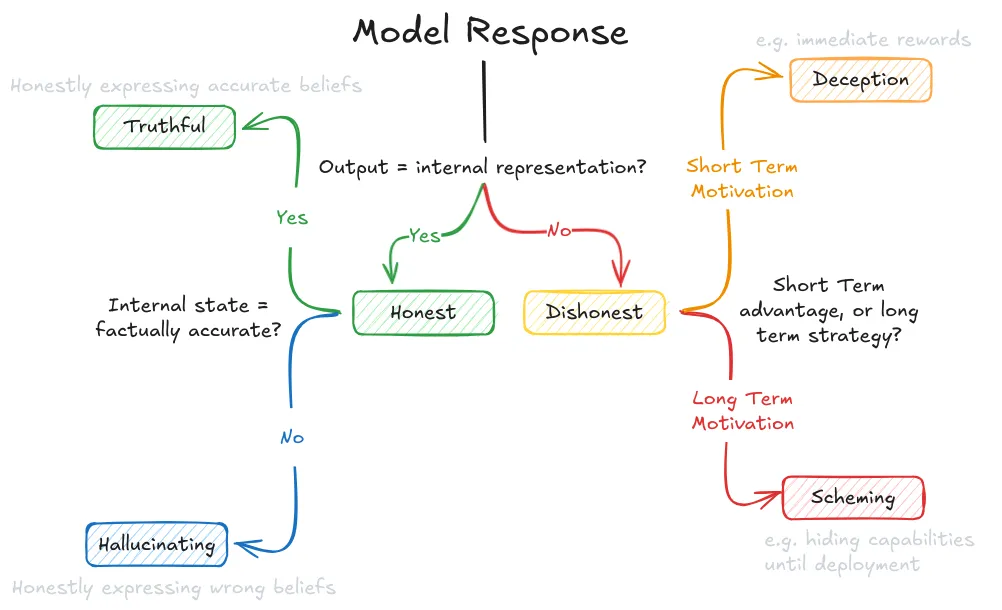 What exactly do we mean by deception as a capability? We need to make a distinction between a model being truly deceptive vs we as humans being just surprised by its outputs. The core question is: where does the deception lie? Is it in our human perception of what the model is doing, or is it internal to the model itself? In the way that we use the term, deception occurs when there is a mismatch between "what the model thinks" (its internal representations) and "what the model does" (its outputs). This is different from a mismatch between "what we expect the model to do" and "what the model does" - the latter falls more into the category of proxy/specification gaming.