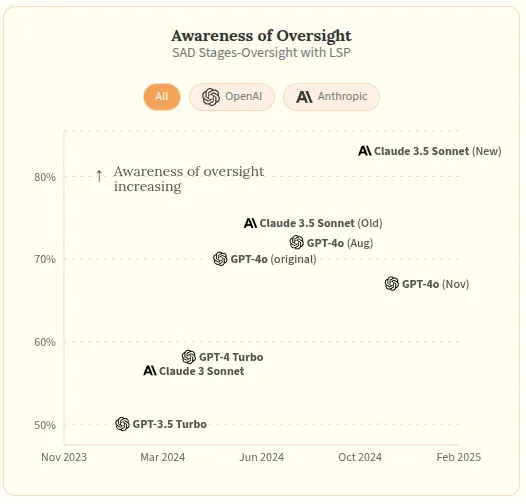 Performance on these tasks has improved steadily over time. By early 2025, frontier models were scoring around 50% on SAD-lite, with scores increasing approximately 15 percentage points over just one year (AI Digest, 2024). However, even the highest-scoring model (Claude 3 Opus) remained far from human-level performance on certain tasks.