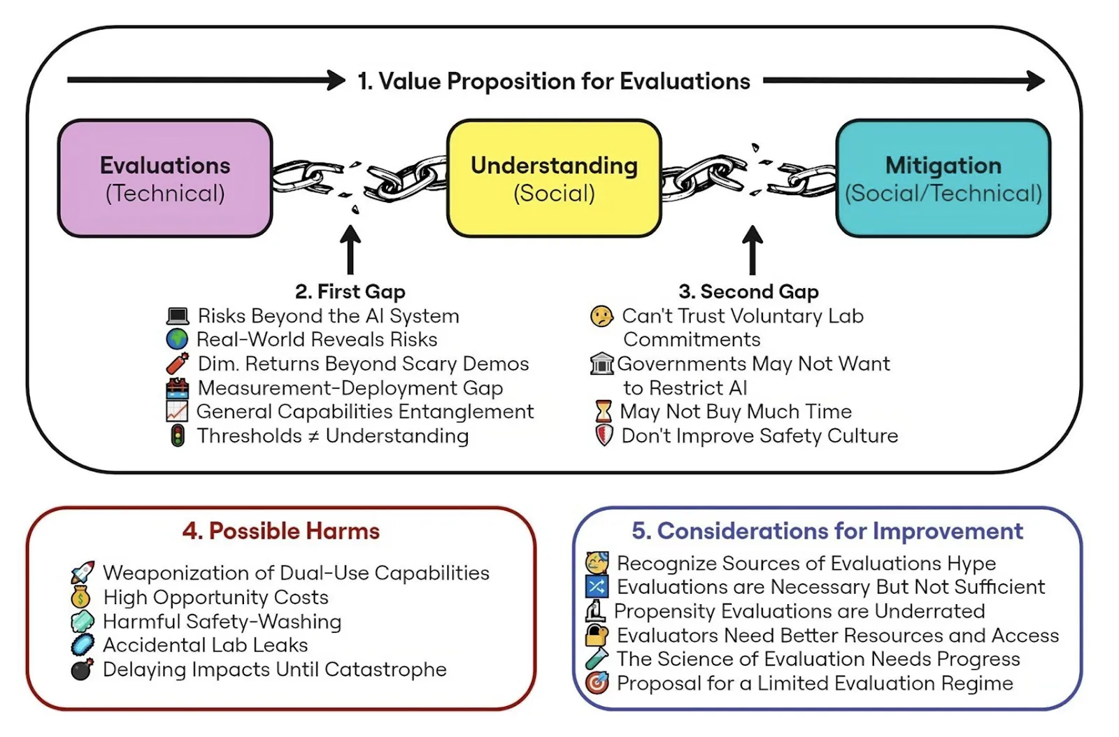 Previous sections outlined various evaluation techniques and methodologies, but building out a proper safety infrastructure means that we should also maintain an appropriate amount of skepticism about evaluation results and avoid overconfidence in safety assessments. So the last section of this chapter is dedicated to exploring the limitations, constraints and challenges to AI evaluations.