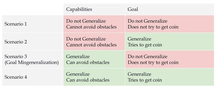 Understanding goal misgeneralization requires examining capabilities and goals separately. Unlike narrow systems designed for specific tasks, general-purpose AI systems must learn to pursue various goals across different contexts. As a concrete example, pre-trained LLMs have general capabilities to generate all sorts of text. Anthropic reinforces its LLMs with the goals of being helpful, harmless, and honest (HHH) during safety training. But what happens when the goal to be helpful generalizes further than the goal to be honest? In this case the model might learn to provide informative responses regardless of content, instead of being helpful within ethical bounds.