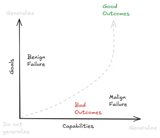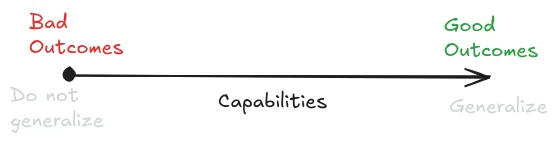 Capabilities might generalize further than goals. "Generalizing further" means continuing to work well even when deployed in environments very different from training. Capabilities follow simple, universal patterns - accurate reasoning, effective planning, and good predictions work the same way across different domains. But there's no universal force that pulls all systems toward the same goals (Soares, 2022). Reality itself teaches systems to be more capable - if your beliefs are wrong or your reasoning is flawed, the world will correct you. But there's no equivalent force from the environment that automatically keeps your goals aligned with what humans want (Kumar, 2022). This asymmetry between capability and goal generalization creates the core safety problem - making systems more capable doesn't automatically make them more aligned - it just makes them better at pursuing whatever behaviors they happen to learn during training.