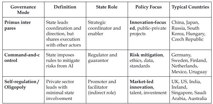Across the last decade, over 30 countries have released national AI strategies outlining their approach to development, regulation, and adoption. These strategies differ widely in emphasis, but when systematically analyzed, they fall into three recurring governance patterns: development, control, and promotion (Papyshev et al., 2023). In development-led models, such as those in China, South Korea, and Hungary, the state acts as a strategic coordinator, directing public resources toward AI infrastructure, research programs, and national missions. Control-oriented approaches, prominent in the European Union and countries like Norway and Mexico, emphasize legal standards, ethics oversight, and risk monitoring frameworks. Promotion-focused models, including the United States, United Kingdom, and Singapore, adopt a more decentralized approach: the state acts primarily as an enabler of private sector innovation, with relatively few regulatory constraints. These differences matter. Any attempt to build international governance frameworks will need to account for the structural asymmetries between these national regimes, particularly around enforcement authority, accountability mechanisms, and institutional capacity (Papyshev et al., 2023).