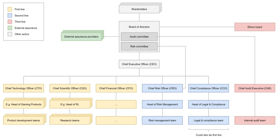 Organizational structures establish who makes decisions and who is responsible for safety in AI companies. Later sections cover specific safety mechanisms, here, we focus on the governance question: who has the authority within companies to prioritize safety over other goals? For example, an effective governance structure determines whether a safety team can delay a model release if they identify concerns, whether executives can override safety decisions, and whether the board has final authority over high-risk deployments. These authority relationships directly affect how safety considerations factor into development decisions.