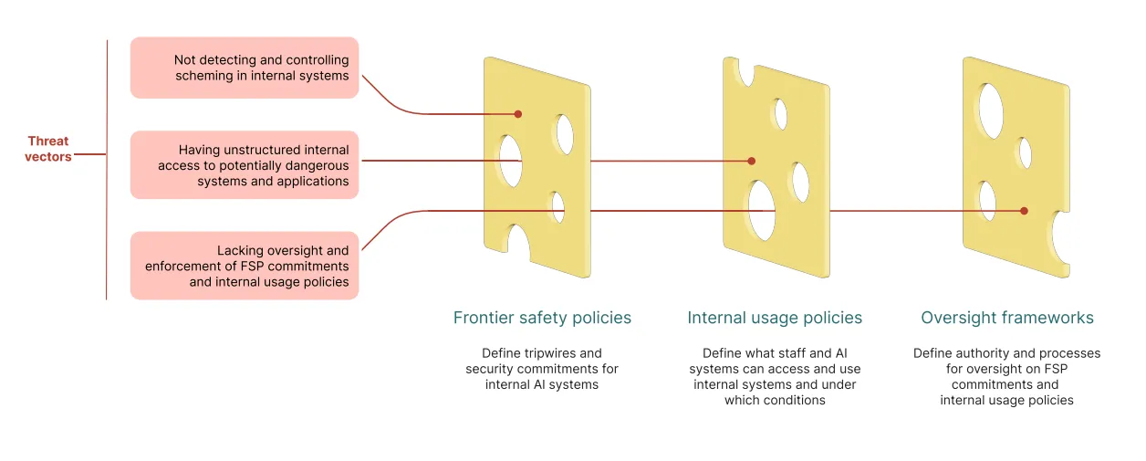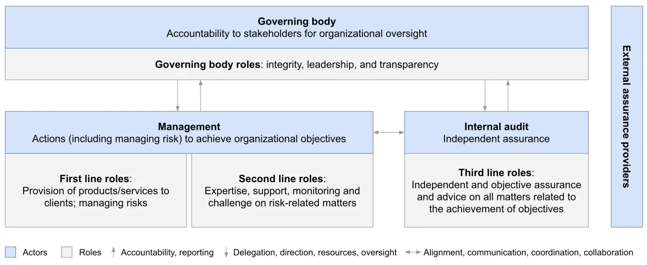 A multi-layered internal auditing and governance approach helps operationalize safety frameworks in practice. When actually implementing the safety frameworks, organizations should ensure risks are identified and managed at multiple levels, reducing the chances of dangerous oversights. For example, when researchers develop a model with unexpectedly advanced capabilities, safety teams can conduct thorough evaluations and implement additional safeguards, while audit teams review broader processes for managing emergent capabilities (Schuett, 2023). One approach is the Three Lines of Defense (3LoD) model adapted from other safety-critical industries (Schuett, 2023):