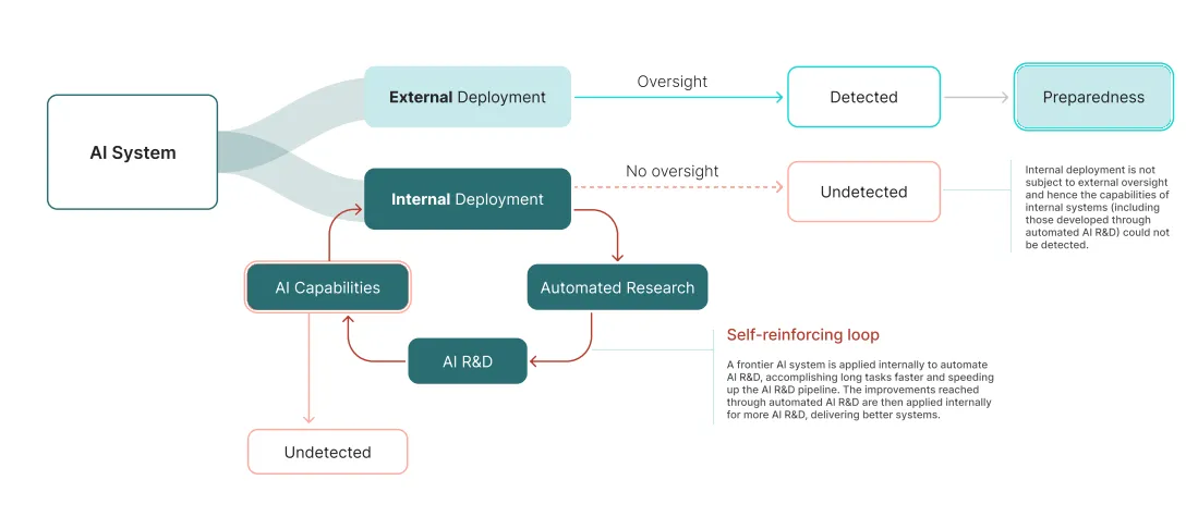 Internally deployed systems also need governance safeguards. Just because a model is not deployed publicly should not mean the corporate governance safeguards do not apply. We have seen in previous chapters that automating AI RnD is one of the core goals of several AI companies, this combined with proliferation safeguards and public release mitigations means that we can see many models that are heavily used internally but not available to the public. These internal deployments often lack the scrutiny applied to external launches and may operate with elevated privileges, bypass formal evaluations, and evolve capabilities through iterative use before external stakeholders are even aware of their existence (Stix, 2025). Without policies that explicitly cover internal use, such as access controls, internal deployment approvals, or safeguards against recursive model use, high-risk systems may advance unchecked (See Figure B.). Yet public knowledge of these deployments are limited, and most governance efforts still focus on public-facing releases (Bengio et al., 2025). Strengthening internal governance around internal deployment is critical to ensure that early and potentially hazardous use cases are properly supervised.