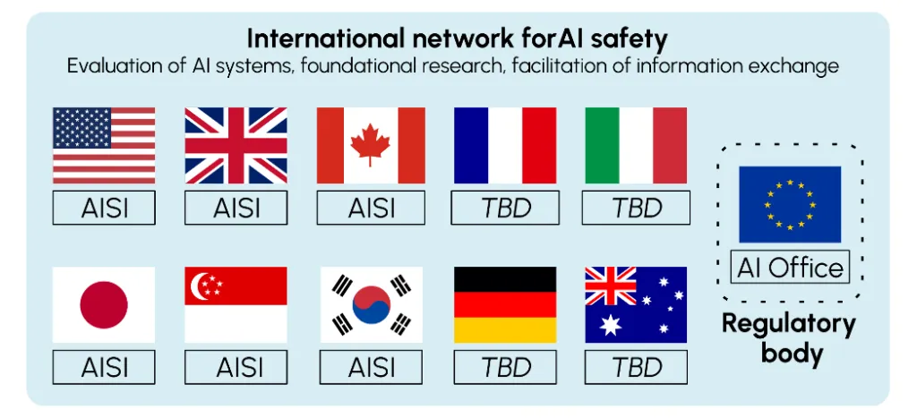 In 2023, the US and UK governments both announced new institutes for AI safety. As of 2025, there are at least 12 national AI Safety Institutes (AISIs) established worldwide. These include institutes from the United States, United Kingdom, Canada, France, Germany, Italy, Japan, South Korea, Singapore, Australia, Kenya, and India. The European Union has established the European AI Office, which functions similarly to national AISIs. These institutes collaborate through the International Network of AI Safety Institutes, launched in November 2024, to coordinate research, share best practices, and develop interoperable safety standards for advanced AI systems.