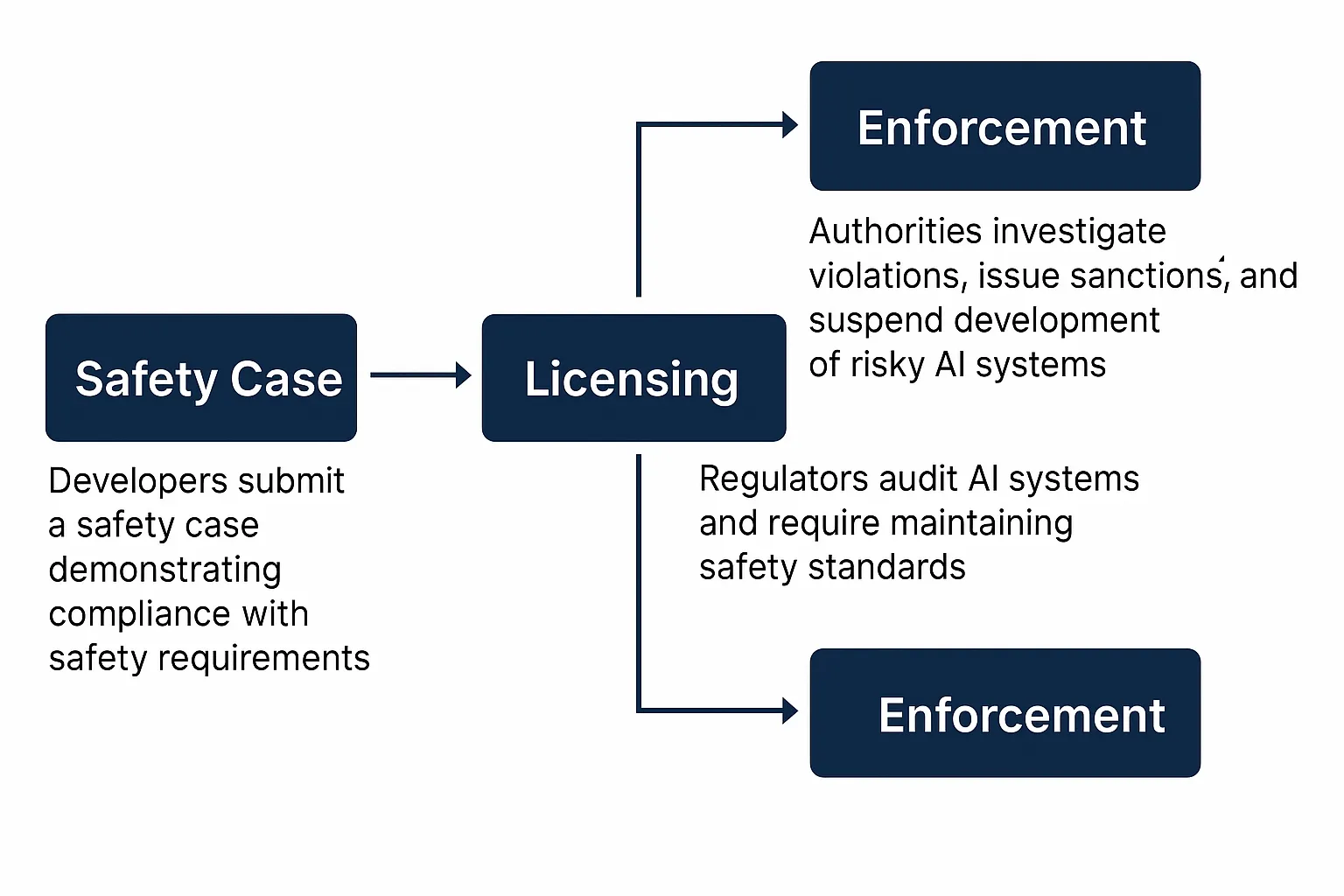 What regulatory tools can ensure compliance with AI safety standards? For high-risk AI systems, oversight mechanisms must go beyond voluntary standards or one-time evaluations. Many researchers have proposed licensing regimes that would mirror regulatory practices in sectors such as pharmaceuticals or nuclear energy. In these domains, operators must obtain and maintain licenses by demonstrating continuous compliance with strict safety and documentation requirements. Applied to frontier AI, this approach would involve formal approval processes before model deployment, periodic audits, and the ability for authorities to revoke licenses in cases of non-compliance (Buhl et al., 2024). A credible licensing framework would require developers to submit a structured safety case, which is a formal argument supported by evidence showing that a system meets safety thresholds for deployment. This could include threat modeling, red-teaming results, interpretability evaluations, and post-deployment monitoring plans. Safety cases provide a mechanism for both ex ante approval and for tracking whether safety claims continue to hold as systems evolve in deployment. Embedding these requirements into the licensing process can help governments establish a continuous cycle of review, feedback, and technical verification (Buhl et al., 2024).