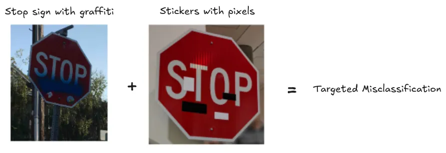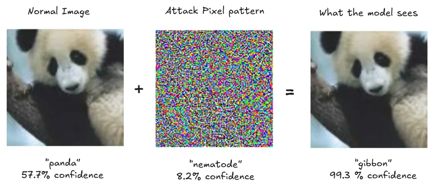 Runtime adversarial attacks use carefully crafted targeted inputs to elicit unintended behavior from AIs. The simplest way to understand runtime attacks is through computer vision. By adding carefully crafted noise to an image - changes so subtle humans can't notice them - attackers can make an AI confidently misclassify what it sees. A photo of a panda with imperceptible pixel changes causes the AI to classify it as a gibbon with 99.3% confidence, while to humans it still looks exactly like a panda (Goodfellow et al., 2014). These attacks have evolved beyond randomized misclassification - attackers can now choose exactly what they want the AI to see and output.