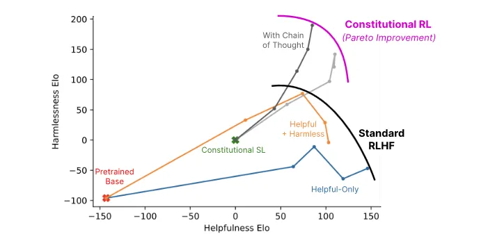 Anthropic's experiments indicate that AIs trained with Constitutional Reinforcement Learning are significantly safer (in the sense of less offensive and less likely to give you potentially harmful information) while maintaining the same level of helpfulness compared to AIs trained with RLHF. While Constitutional AI does share some issues with RLHF concerning robustness, it also promises better scalability due to its reduced reliance on human supervision. The image below provides a comparison of Constitutional AI's helpfulness with that of RLHF.
