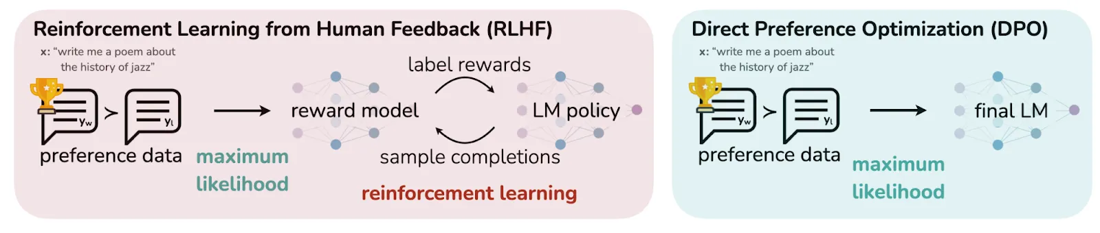 Direct Preference Optimization (DPO): Reinforcement Learning from Human Feedback (RLHF) has demonstrated effectiveness, as showcased by ChatGPT and Llama 2, but it's a complex and sensitive process, and also has some bad alignment properties. RLHF involves a three-step procedure, whereas DPO simplifies this to two steps. The paper titled "Direct Preference Optimization: Your Language Model is Secretly a Reward Model" presents an algorithm that aligns language models with human preferences without the need for explicit reward modeling and reinforcement learning. DPO employs a straightforward classification objective, circumventing the need for an intermediary reward model.