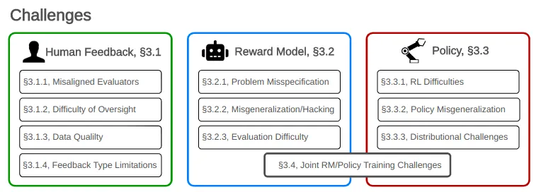 The paper “Open Problems and Fundamental Limitations with RLHF” provides a comprehensive breakdown of challenges in RLHF.