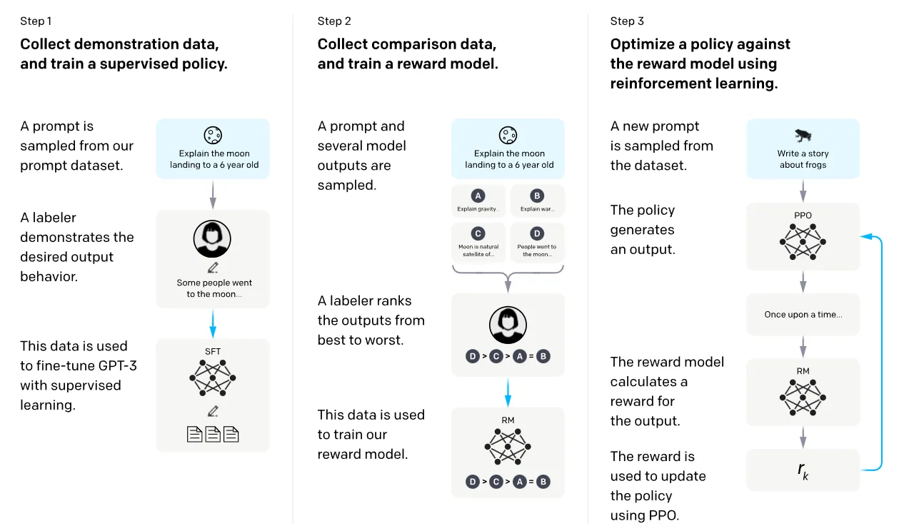Reinforcement Learning from Human Feedback (RLHF) is a method developed by OpenAI. It's a crucial part of their strategy to create AIs that are both safe and aligned with human values. (OpenAI, 2023) A prime example of an AI trained with RLHF is OpenAI’s ChatGPT.