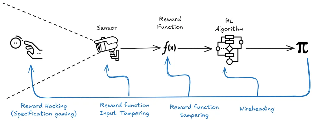 Reward tampering involves the agent interfering with various parts of this reward process. An agent might distort the feedback received from the reward model, altering the information used to update its behavior. It could also manipulate the reward model's implementation, altering the code or hardware to change reward computations. In some cases, agents engaging in reward tampering may even directly modify the reward values before processing in the machine register. Depending on what exactly is being tampered with we get various degrees of reward tampering. These can be distinguished from the image below.
