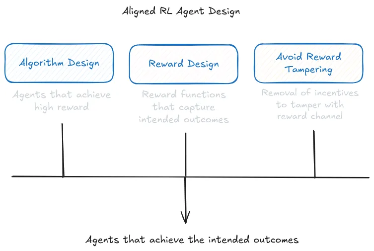 While RL algorithm design focuses on the learning and decision-making mechanisms of the agent, RL reward design focuses on defining the objective and shaping the agent's behavior through the reward function. Both aspects are crucial in the development of effective and aligned RL systems. A well-designed RL algorithm can efficiently learn from rewards, while a carefully designed reward function can guide the agent towards desired behavior and avoid unintended consequences. The following diagram displays the three key elements in RL agent design—algorithm design, reward design, and the prevention of tampering with the reward signal: