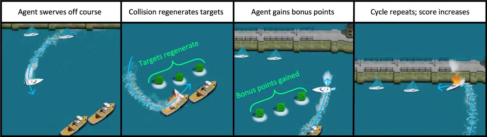 As a concrete example, one agent in the Coast Runners game was trained with the objective of winning the race. The game uses a score mechanism, so in order to progress to the next level the reward designers used reward shaping to reward the system when it scored points. These were given when a boat gets items (such as the green blocks in the animation below) or accomplishes other actions that presumably would help it win the race. Despite being given intermediate rewards, the overall intended goal was to finish the race as quickly as possible. The developers thought the best way to get a high score was to win the race but it was not the case. The agent discovered that continuously rotating a ship in a circle to accumulate points indefinitely optimized its reward, even though it did not help it win the race.