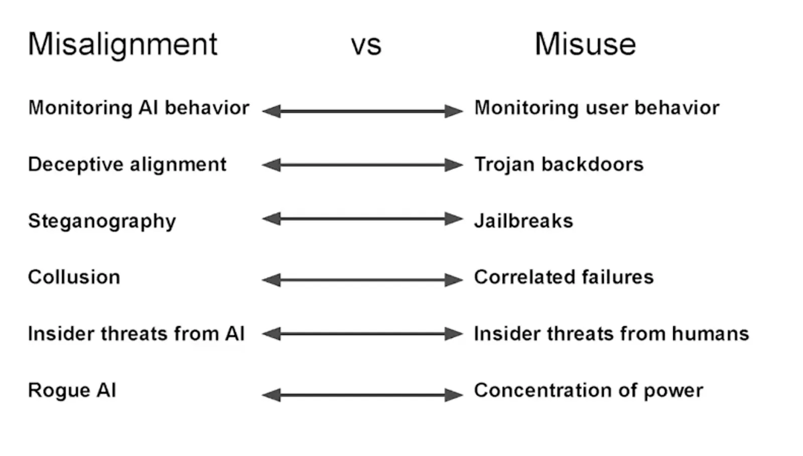 Unlike misuse, where human intent is the driver of harm, AGI safety is primarily concerned with the behavior of the AI system itself. The core problems are alignment and control: ensuring that these highly capable, potentially autonomous systems reliably understand and pursue goals consistent with human values and intentions, rather than developing and acting on misaligned objectives that could lead to catastrophic outcomes.