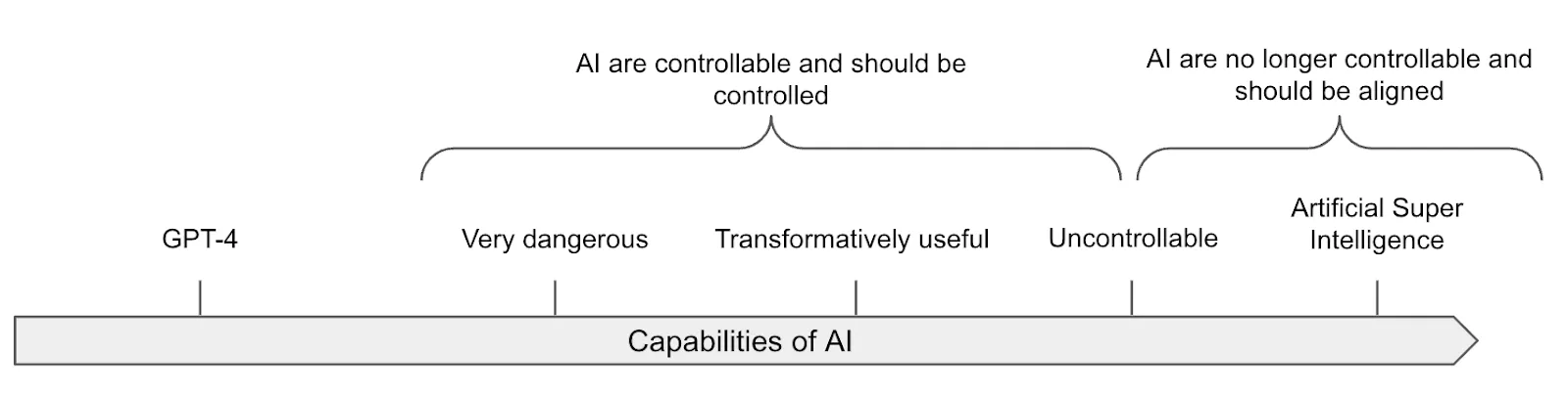 Strategies for AGI and ASI safety often get conflated, stemming from uncertainty about transition timelines. Timelines are hotly debated in AI research. Some researchers expect rapid capability gains that could compress the period for how long AIs remain human-level into months rather than years (Soares, 2022; Yudkowsky, 2022; Kokotajlo et al., 2025). If the transition from human-level to vastly superhuman intelligence happens quickly, AGI-specific strategies might never have time for deployment. However, if we do have a meaningful period of human-level operation, we have safety options that won't exist at superintelligent levels, making this distinction important for strategic considerations.