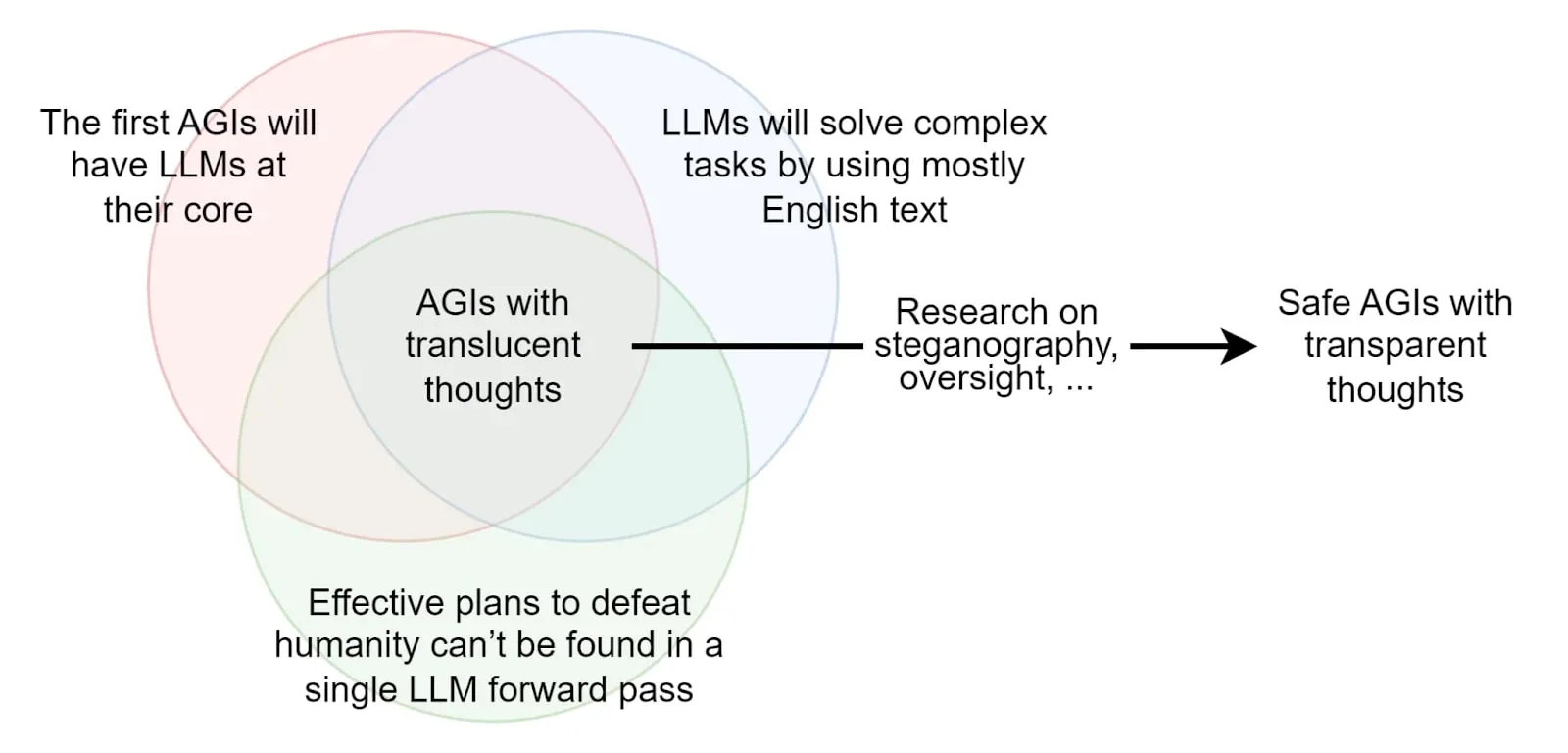 Nevertheless, several factors might ultimately limit CoT monitoring effectiveness in advanced systems. These include architectural changes enabling opaque recurrent processing (sometimes called "neuralese"), the development of steganographic capabilities that could hide reasoning within seemingly benign outputs, or simply much stronger forward passes that require less explicit reasoning. Of these, the development of opaque reasoning abilities through neural recurrence may represent the most significant challenge to maintaining the transparency needed for effective monitoring. This whole agenda depends notably on the hypothesis that "Effective plans to defeat humanity cannot be found in a single LLM forward pass." Once AIs become too strong in a forward pass, most hopes of translucent thoughts go away, so either you need to succeed at ambitious CoEm by building a giant superhuman transparent bureaucracy, or we need new approaches. This is the topic of ASI Safety.