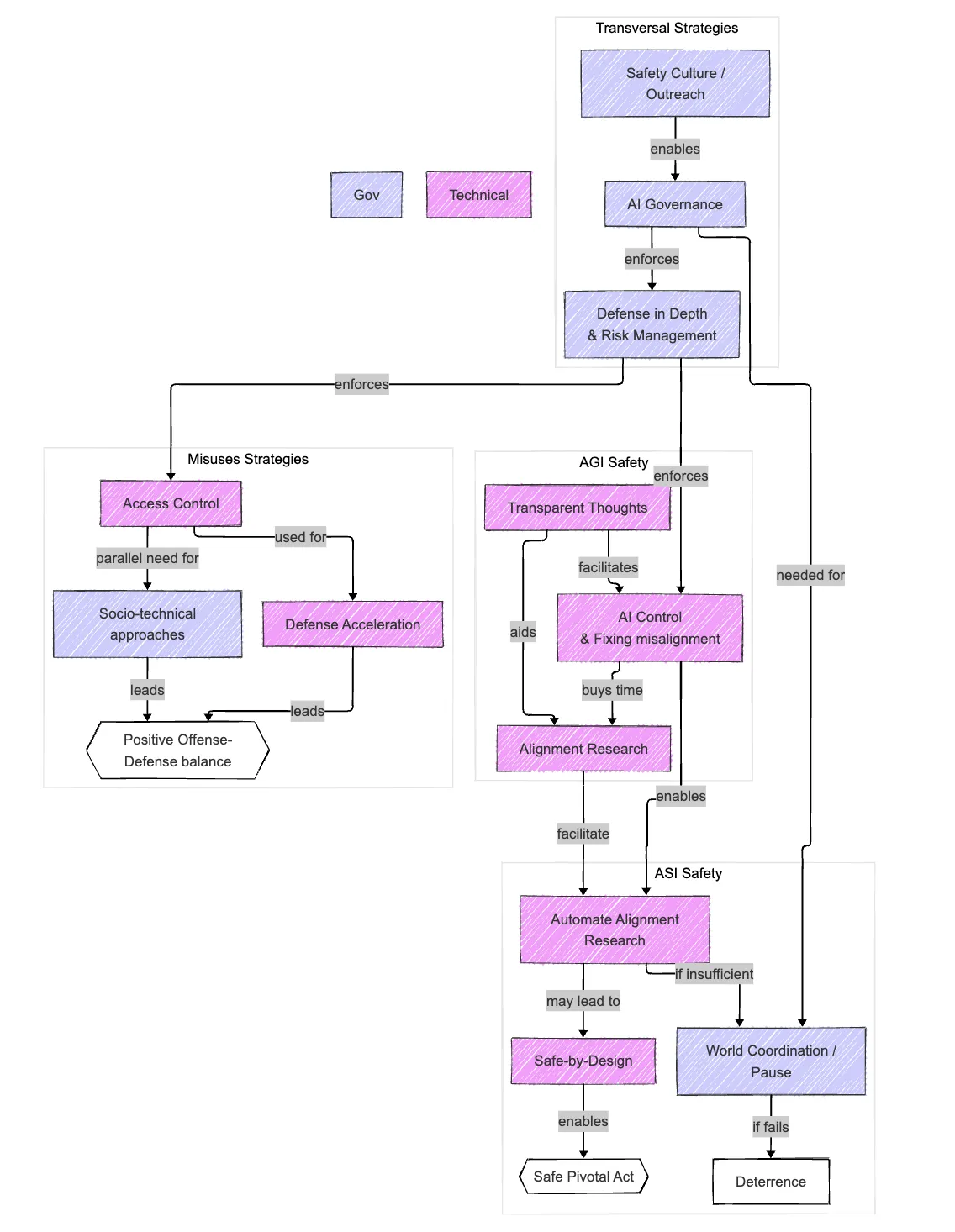 Step 4: A Robust Solution for ASI Alignment. Finally, for the superhuman leap, direct control is probably impossible. But the strategy can become meta: use our controlled AGI to Automate Alignment Research. This is our best shot at a high-reliability solution. If this fails, geopolitical strategies like Coordination or Deterrence become the last, desperate lines of defense. Developing a high-reliability solution for ASI alignment is the holy grail. A leading strategy is to leverage controlled AGI to Automate Alignment Research. If successful, this could lead to the creation of inherently Safe-by-Design systems. A powerful, truly aligned ASI could then be used to perform a 'pivotal act', i.e. a decisive intervention designed to permanently solve the global coordination problem and end the acute risk period from unaligned ASI development. However, if this research reveals that powerful AI cannot be created without unacceptable risks, the international community would need to coordinate a global pause or moratorium. If such World Coordination proves impossible, strategies of last resort, such as Deterrence regimes like MAIM, might become necessary to prevent any single actor from unilaterally developing uncontrollable ASI.