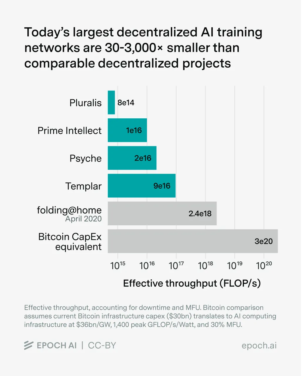 Figure 3.6 - Bitcoin is often called the world's largest decentralized computer. Its $30 billion infrastructure provides one benchmark for what decentralized computing can achieve at scale. The folding@home network demonstrated that volunteer computing can reach 2.43e18 FLOP/s—sufficient for training runs of approximately 2e25 FLOP, matching previous-generation frontier models like Llama 3, GPT-4, or Claude 3 Opus. These comparisons suggest decentralized networks could grow 30-3,000x from current levels over the next 3-6 years. However, they remain unlikely to amass frontier amounts of compute this decade compared to centralized training runs approaching 3e27 FLOP (Sevilla, 2025).