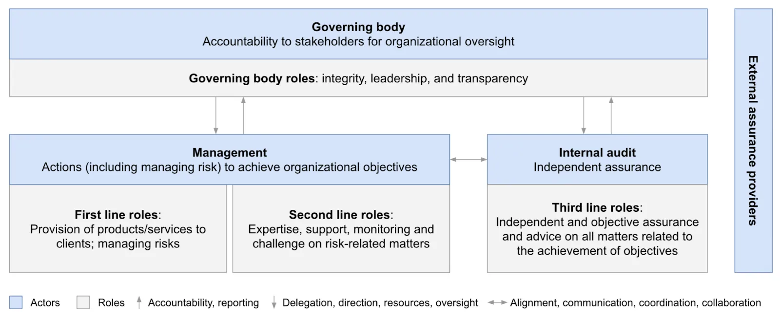Risk governance establishes who does what and who verifies how it's done. Most industries use a three lines of defense model. The first line consists of operational managers who build systems and own daily risk decisions. The second line includes specialized risk teams that advise and challenge business decisions. The third line is internal audit - independent from peer pressure, reporting to the board to verify the system works. Beyond this structure, governance includes board-level oversight, risk culture throughout the organization, and external transparency about risks and decision-making processes (Schuett, 2022).