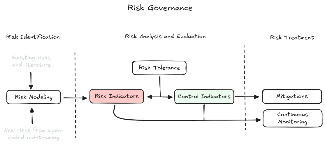Risk management ensures that risks minus mitigations remain below tolerance levels. The core equation is simple: (Risks - Mitigations) < Tolerance. This operational process connects everything else - governance sets rules, evaluations measure capabilities, safety culture establishes norms, but risk management makes the daily decisions about whether to pause training, which mitigations to implement, and how to maintain acceptable risk levels throughout development. The framework has four interconnected components: identification, analysis, treatment, and governance (Campos et al., 2024). Each addresses a distinct question about managing AI risks systematically.