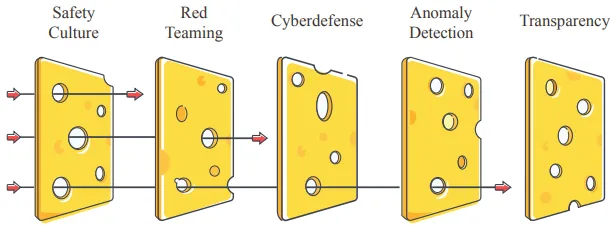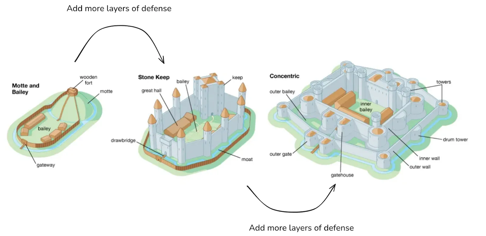 Defense-in-depth means layering multiple independent protections so that if one fails, others provide backup. This is one meta-philosophy underlying effective AI safety: multiple independent layers of protection working together. Think about it like designing a medieval castle - walls, moats, towers, and inner baileys created redundant barriers where breaching one layer didn't mean total compromise. Modern cybersecurity applies the same logic: firewalls, encryption, access controls, and monitoring systems operate simultaneously, each addressing different attack vectors. No single security measure is perfect, but multiple imperfect defenses working together can create robust protection. This is also commonly known as the swiss cheese model of safety (Hendrycks et al., 2023).