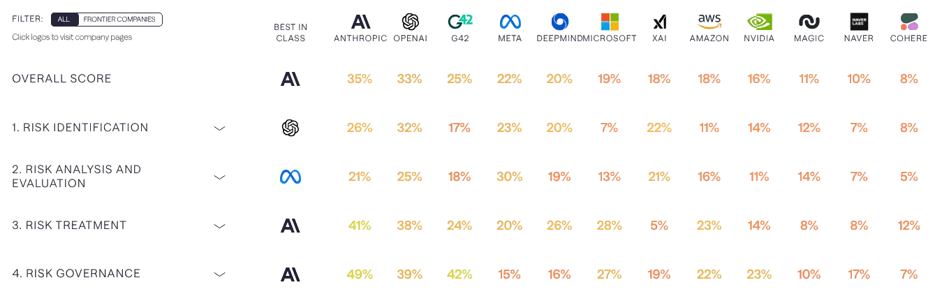 An extremely detailed analysis of current risk management and safety practices is conducted by saferAI available here. Every category - identification, analysis, treatment and governance is further decomposed into extremely granular metrics that are tracked and analyzed to give risk ratings to all frontier AI organizations.